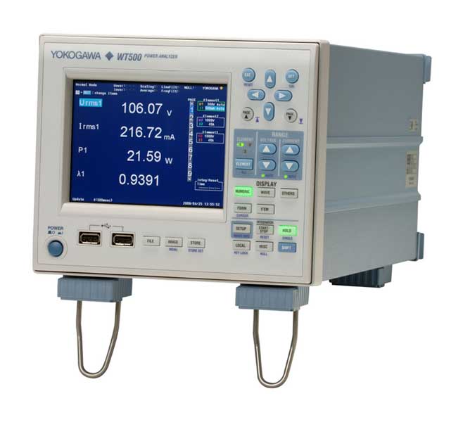 WT500 功率分析儀是一款可測量單相和三相功率的中端產品。半機架機身設計,緊湊結構,可進行雙機架安裝。標準配置包括彩色液晶顯示屏、用於通訊和存儲的USB接口等。基本精度為0.1%,最大輸入為1000Vrms 40Arms,測量帶寬為DC到100kHz。
