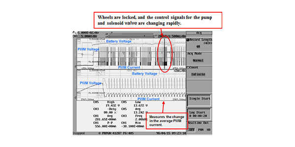 上圖為ABS控制單元運作測試中所獲得的測量數據。我們讓車輪鎖死,並測量電池電壓波動對 PWM 電流訊號的影響。